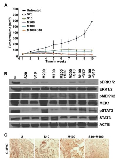 Our in vitro findings encouraged us to investigate the significance of metformin and low-dose sorafenib combination in vivo. Mice bearing HepG2-derived tumors exhibited decreased tumor growth in drug-treatment groups in comparison to the vehicle-treatment group. Low-dose sorafenib and metformin combination group showed efficient tumor inhibition comparable to high-dose sorafenib. Importantly, the extent of tumor volume reduction attained with S20 and M200 treatment level was attained at the half dose (S10 + M100) in the combination group (Figure 4A). Immunoblot analyses of tumor xenografts corroborated our in vitro findings and revealed decreased expression of phosphorylated ERK1/2, MEK1/2, and Stat3 in the combination treatment group compared to either monotherapy (Figure 4B). Immunohistochemical analyses of the tumor samples showed reduced expression of C-MYC in the combination treatment groups compared to vehicle- or monotherapy-treated groups (Figure 4C). Collectively, these data show that a combination regimen of low-dose sorafenib and metformin is as effective as high-dose sorafenib (standard dose) in achieving effective inhibition of growth, invasion, and migration of HCC cells as well as blocking HCC tumor progression.