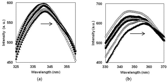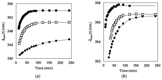 Dependences of the wavelength of the maximum fluorescence on proteolysis time: (a) proteolysis of β-LG (0.25 g/L) by trypsin at a concentration of 15 (■), 4.5 (□) and 0.9 mg/L (●); (b) proteolysis of β-CN (0.25 g/L) by trypsin at a concentration of 2.5 (■), 0.5 (□) and 0.25 mg/L (●). Solid lines correspond to the fitting of experimental points using Equation (11).