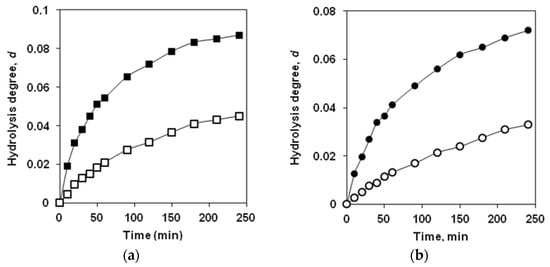Dependences of the degree of hydrolysis on proteolysis time: (a) proteolysis of β-LG (0.25 g/L) by trypsin at a concentration of 5 (■) and 1 mg/L (□); (b) proteolysis of β-CN (0.25 g/L) by trypsin at a concentration of 0.5 (●), and 0.1 mg/L (○).
