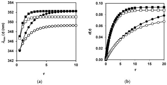 An example of λmax(τ) and d(τ) dependences is presented for two concentrations of the enzyme and two values of the parameter κm (Figure 4). The dependences λmax(τ) were calculated using Equation (11) in the dimensionless form in the absence (κm = 0) and in the presence of the secondary masking. For each of these cases, the calculations were performed at two enzyme concentrations (Figure 4a). Equation (16) was used to calculate d(τ) for a set of the kinetic parameters given in Section 4.5 (Figure 4b). In the absence of the secondary masking (κm = 0), the curves λmax(τ) and d(τ) grow faster at a higher enzyme concentration. The asymptotes, representing the upper values of these functions when time tends to infinity, are the same at κm = 0 regardless of the enzyme concentration. In the presence of the secondary masking, the curves λmax(τ) and d(τ) grow faster at the higher enzyme concentration, and the asymptotes for these functions increase with the increasing enzyme concentration.