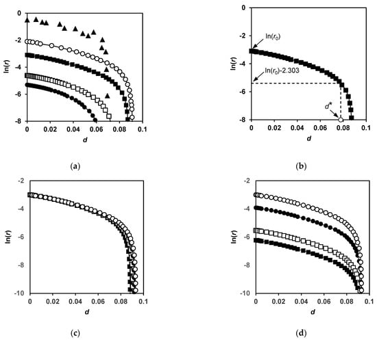Dependences of the logarithm of hydrolysis rate ln(r) on degree of hydrolysis d: (a) experimental data (▲) and calculated dependences for κm = 0.05 at ε = 0.2 (●), 0.4 (□), 2 (■), and 5 (○); (b) illustration of the definition of d* value (○); (c) simulated dependences for ε = 2 at κm = 0.05 (■), 0.025 (□), 0.012 (●), and 0 (○); (d) simulated dependences for κm = 0 at ε = 0.2 (■), 0.4 (□), 2 (●), and 5 (○).