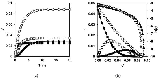 A differentiation of the dependence d(t) (Figure 4b) allowed the determination the dependence of the rate of hydrolysis r(t) on t. Then, time was excluded from both dependences ln(r(t)) and d(t), which made it possible to construct the dependence ln(r(d)) from d. The functions of the logarithm of the rate of hydrolysis on the degree of hydrolysis were built from experimental data and also simulated using Equations (12)–(15) (Figure 5). For the proteolysis of β-LG by trypsin, the experimental dependence ln(r(d)) in a certain range of d is almost linear, while at large d values, the curve drops sharply (Figure 5a). The calculated dependencies shown in Figure 5 behave in a similar way.