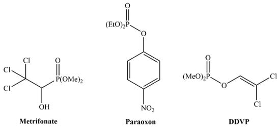Several organophosphorus compounds (OP) such as esters, thiol esters, acid halides, or anhydrides of pentavalent phosphorus-containing acids (phosphates and phosphonates) are known to inhibit serine esterases [,,]. The general structure of such inhibitors is R1R2P(O)X, where R1 and R2 substituents are usually simple alkyl or aryl groups that can be connected to phosphorus directly or through an intervening -O-, -S- or -NH- linkage []. Among thoroughly studied OP serine esterase inhibitors we can lineup DFP, diisopropyl fluorophosphate; paraoxon, diethyl p-nitrophenyl phosphate; DDVP, O,O-dimethyl O-(2,2-dichlorovinyl) phosphate; metrifonate, (2,2,2-trichloro-1-hydroxyethyl)phosphonic acid dimethyl ester (Figure 1) [].
