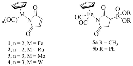 Structure of the metallocarbonyl complexes CpM(CO)n(η1-N-maleimidato) (M = Fe, n = 2 (1), M = Ru, n = 2 (2), M = Mo, n = 3 (3), M = W, n = 3 (4)) and half-sandwich iron phosphonate complexes (5a–b).