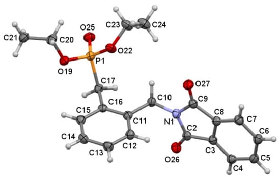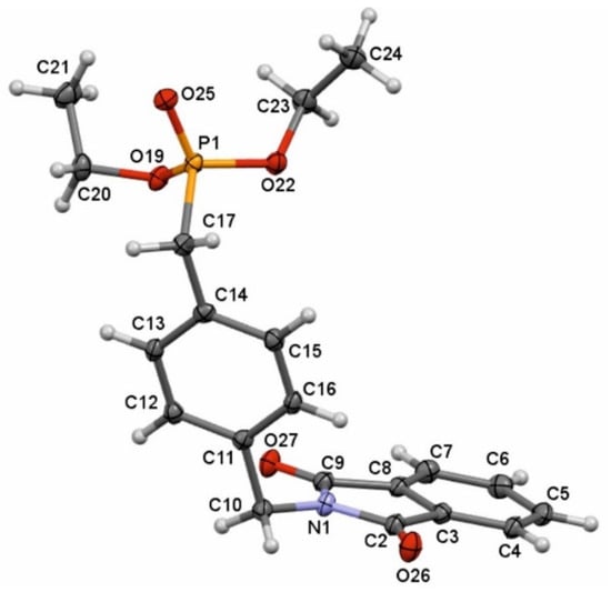 In the first step, α,α’-dibromo or dichloro-I-xylene (I = o, m, p) undergoes the Arbuzov reaction with triethyl phosphite to give diethyl (halogenomethyl)benzylphosphonates 6a–c following the procedure developed by Bessieres et al. []. Compounds 6a–c were obtained in high yields (71–84%) and were consecutively characterized by spectroscopic methods (1H, 13C NMR, IR) and mass spectrometry. For the second step, the diethyl(dioxoisoindolin-2-yl)methyl)benzylphosphonates 7a–c were obtained by reaction of 6a–c with the sodium salt of phthalimide in dry acetonitrile according to the procedure reported by Škopić et al. with modifications []. The resulting products 7a–c were obtained in high yields ranging from 74% to 93%. The molecular composition of compounds 7a–c was established by 1H, 13C NMR, IR, and mass spectrometry, and in the case of compounds 7a and 7c, structures were determined by single-crystal X-ray diffraction (Figure 3 and Figure 4).