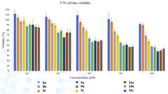 Viability of the V79 cell line after treatment with compounds.