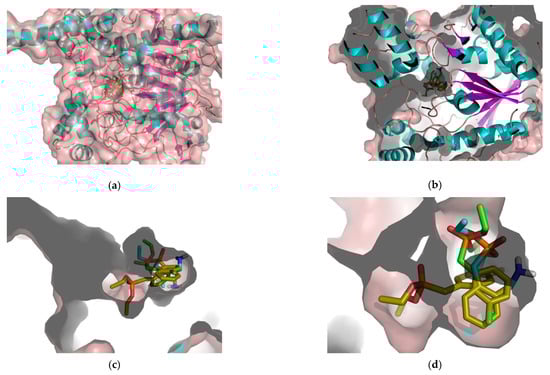 (a–d) The structure of electric eel AChE with the three ligands 8a–c. (a) The overall structure of the protein with secondary structure projection and protein surface; (b) the protein projection with all three compounds, 8a–c; (c,d) the active side of the eeAChE with three ligands.