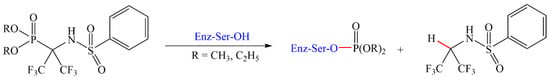 Makhaeva et al. reported new fluorinated aminophosphonates that irreversibly inhibit four serine esterases: AChE, BuChE, carboxylesterase, and neuropathy target esterase, a phospholipase that deacetylates intracellular phosphatidylcholine to produce glycerophosphocholine (Scheme 1) []. The presence of the two trifluoromethyl groups increased the electrophilic character of phosphonate which has a higher rate of reaction with nucleophiles.