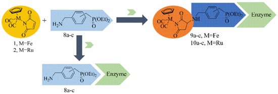 To increase the potency of these inhibitors, we designed a hybrid structure based on a diethyl phosphonate motif linked through a spacer (methylenebenzylamine) with metallocarbonyl iron and ruthenium complexes. In this paper, we report an efficient three-step synthetic route to a series of (aminomethyl)benzylphosphonates starting from α,α‘-dibromo or dichloro-I-xylene (I = o, m, p). Subsequently, the (aminomethyl)benzylphosphonate 8a–c intermediates were reacted with the maleimide ligand of the CpM(CO)2(η1-N-maleimidato) (M = Fe, Ru) complex to give metallocarbonyl aminophosphonate derivatives 9a–c and 10a–c. The basic idea is the combination of phosphonate properties with the effectiveness of metallocarbonyl complexes as drugs. The overall approach to targeted metallocarbonyl aminophosphonates is depicted in Scheme 2.