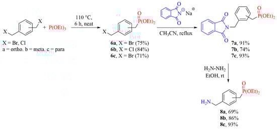 Triethylphosphite (1 equiv) was dropwise added to α,α’-dibromo or dichloro-I-xylene (I = o, m, p) to a two-necked flask fitted with a Dean–Stark separator to remove bromoethane or chloroethane. The reaction mixture was heated to 110 °C for 6 h and then cooled to rt. The product was purified by column chromatography on silica gel (ethyl acetate to ethyl acetate/MeOH 80:20) to give diethyl (bromo or chloromethyl)benzylphosphonates (6a–c) in yields ranging from 71% to 84%. Details-Supplementary Data (Table S1).