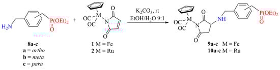 The reaction of metallocarbonyl complexes 1–2 with aminophosphonates 8a–c was carried out under mild conditions using a mixture of ethanol and distilled water (9:1) as a solvent at room temperature. Half-sandwich iron 9a–c and ruthenium 10a–c aminophosphonate complexes were obtained through the aza-Michael addition of (aminomethyl)benzylphosphonates 8a–c to the electron-deficient double bond of the maleimidato ligand of iron 1 and ruthenium 2 complexes using potassium carbonate as a base (Scheme 4). The aza-Michael reaction of primary amines to maleimide ligands was previously described by us [] and found applications in the conjugation of the metallocarbonyl moiety to biomolecules and dendrimers [].