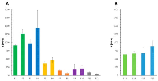 Mechanical properties of the films F1–F12 (A) and F13–F16 (B) expressed as Young’s modulus (E) (mean ± standard deviation (SD), n ≥ 3, p < 0.05). Formulations with the same polymer ratio and deposition order, but different LM PC type were indicated with the same color.