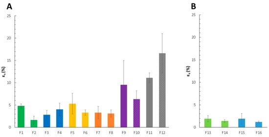 Mechanical properties of the films F1–F12 (A) and F13–F16 (B) expressed as elongation at break (εs) (mean ± SD, n ≥ 3, p < 0.05). Formulations with the same polymer ratio and deposition order, but different LM PC type were indicated with the same color.