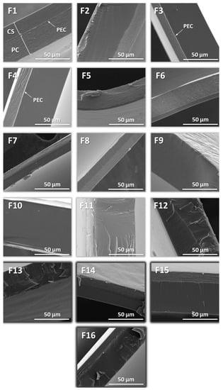 The order of polyelectrolyte deposition turned out to be crucial for the intensity of CS–PC ionic interactions. As the SEM images showed (Figure 3), reorganization of both CS and PC chains toward the polymer contact surface was observed; nevertheless, it was mainly characteristic for F8. The F7–F8 films were visually inhomogeneous, with the presence of wrinkles and areas of PEC precipitates placed throughout the whole films, which was also illustrated by the SEM analysis. The films F5–F6 had inhomogeneous cross-sections with a noticeably dominant layer of PC divided from a thin coat of CS with a visible PEC layer. The presence of air bubbles affected the non-uniform morphology of the films. Very interesting observations were made for F9–F12. These composites were homogeneous in the visual evaluation; nevertheless, deposition of PC of each type in the second step (F9–F10) resulted in the polyelectrolytes mixing across the whole width of the films and therefore the monolayer architecture. In the SEM analysis, a very dynamic process of 2% CS interpenetration throughout ten-fold less concentrated PC was illustrated.