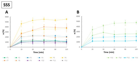 Swelling behavior of F1–F12 (A) and F13–F16 (B) films in the simulated saliva solution (SSS) (mean ± SD, n = 3).