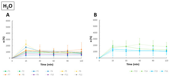 Swelling behavior of F1–F12 (A) and F13–F16 (B) films in purified water (mean ± SD, n = 3).