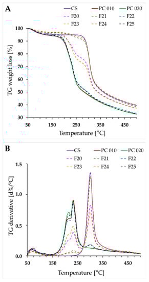 TGA profiles (A,B) of CS, PC 010, PC 020, and their physical mixtures in the polymer ratios corresponding to the films composition (F20—CS:PC 010 1:1, F21—CS:PC 010 10:1, F22—CS:PC 010 1:10, F23—CS:PC 020 1:1, F24—CS:PC 020 10:1, F25—CS:PC 020 1:10).
