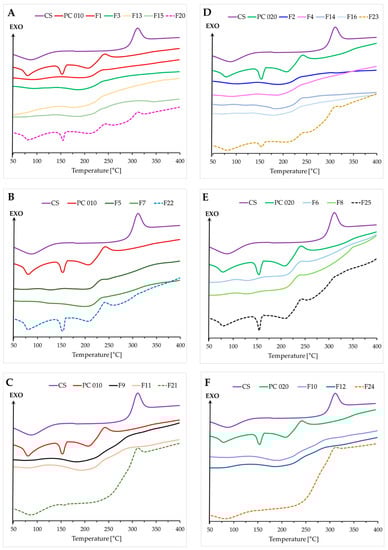 DSC curves for “pure” polyelectrolytes (CS, PC 010, PC 020), the films F1–F16, and the corresponding physical mixtures (F20–F25) (A–F).
