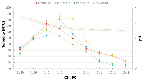 Turbidity (continuous line) and pH fluctuations (dashed line) recorded for CS/PC mixtures with different polymer ratio, polyelectrolyte deposition, and PC type (mean ± SD, n = 3).