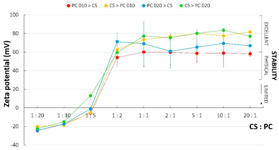 In this study, changes in the zeta potential values were similar regardless of PC type and the applied order of polyelectrolytes mixing (Figure 9). What was interesting was that CS addition resulted in very high zeta potential, indicating excellent stability of the PECs dispersions [42]. While the point of charge neutralization was observed for the ratio of CS to PC 010 close to 1:5, the addition of CS to PC 020 led to stoichiometric PECs preparation at the point between the 1:10 and 1:5 ratios. Zeta potential values recorded for samples based on PC 020 were inconsistent, since an addition of CS to PC solution resulted in more rapid stoichiometric PEC formation as the turbidity test confirmed. Simultaneously, the range of CS:PC weight ratios 1:10–1:5 was recognized as relevant to charge neutralization.