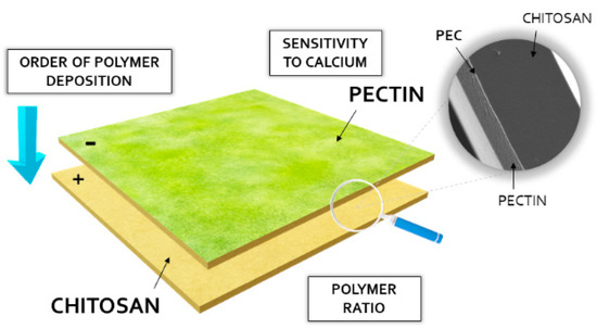 Materials based on polyelectrolyte complexes (polycomplexes, PECs) have been under detailed investigation over the last years as structures with great possibilities in multifunctional systems development. Multilayer PEC-based films are characterized by huge potential in tissue engineering and chemical or pharmaceutical technology. They are characterized by unique properties arising from combining polymers with different characteristics enriched with the special properties of PEC structures [1,2,3]. Preparation of PECs does not require any addition of toxic cross-linking agents but usually occurs after mixing aqueous solutions of polyelectrolytes. Since rapid interactions between oppositely charged polymers might lead to PECs’ coacervation/precipitation, separation of insoluble PEC particles is one of the methods to preserve the homogeneity of the systems with regard to their further utilization [4]. Considering the number of factors that usually impact PECs’ performance, such as polymer properties (molecular weight, charge distribution, pKa, solubility, chain flexibility), ionic strength, pH values affecting the polyelectrolytes’ ionization degree, temperature, concentration of the interacting compounds, polymer ratio, and preparation technique, precise evaluation of the polyelectrolytes should always be performed prior to the highly controlled process of PEC formation [5,6,7,8]. There are numerous criteria of PEC classification; nevertheless, differentiation of polycomplexes on water-soluble non-stoichiometric and water-insoluble stoichiometric structures is most often invoked [5].