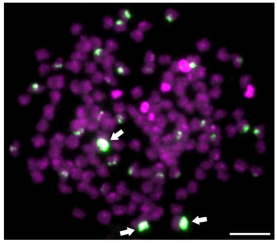 Fluorescent in situ hybridization (FISH) with 5S ribosomal probes on Carassius hybrid female with 156 chromosomes. Three highly intensive 5S gene loci in green (arrowheads) out of twenty-seven show triploid origin of this female. Chromosomes are counterstained with 4’,6-diamidino-2-phenylindole (DAPI) in blue and red. Scale bar represents 10 m. Figure was modified according to Knytl et al. [67].