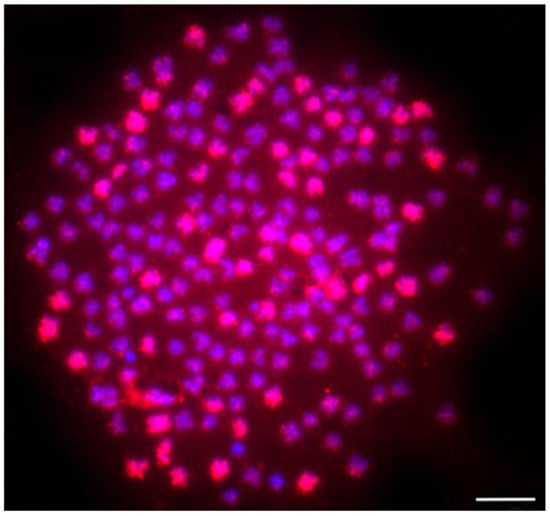 Genomic in situ hybridization (GISH) identified a wild Carassius hybrid female with 206 chromosomes. The 50 paternal (C. carassius) chromosomes are labeled with the whole genome painting probe, shown here in red. The other 156 maternal chromosomes (C. gibelio) are labeled by DAPI, in blue. Scale bar represents 10 m. Figure was modified according to Knytl et al. [21].