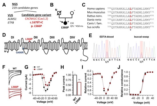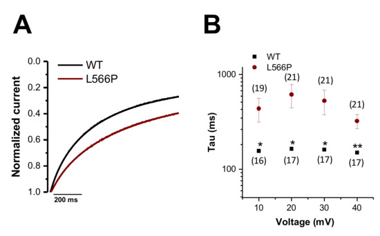2.4. Loss-of-Function by Altered Current Amplitudes of CaV1.2L566P Mutant Channels