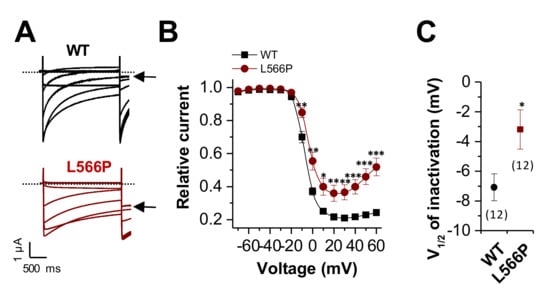 Reduced and shifted voltage dependence of inactivation of CaV1.2L566P. (A) Representative current traces of CaV1.2WT (black) or CaV1.2L566P (red) recorded from a holding potential of −80 mV. Voltage was stepped to potentials ranging from −70 to +60 mV in 10 mV increments for 2 s, followed by a step to +10 mV. The sweep time interval was 30 s. (B) Steady-state inactivation curves derived by plotting the prepulse potential against the initial current recorded at the test pulse at 10 mV. (C) V1/2 of inactivation of CaV1.2WT (black) or CaV1.2L566P (red) derived by fitting the data from (B) to a Boltzmann equation. The number of experiments is indicated. ***, p < 0.001; **, p < 0.01; *, p < 0.05.