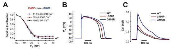 2.7. In Silico Modeling the Effects of CaV1.2G406R and CaV1.2L566P on Cardiac Action Potentials