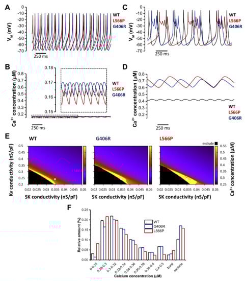 While the WT beta cell did not burst with these parameters (Figure 5C), both mutant cells burst with the CaV1.2L566P cell having a lower frequency but a longer burst phase. This led to differences in the intracellular calcium concentrations (Figure 5D). For WT, the mean concentration increased from 0.166 µM to 0.42 µM, for CaV1.2G406R from 0.167 µM to 0.667 µM, and for CaV1.2L566P from 0.16 µM to 0.688 µM. Figure 5E,F show the result of a sensitivity analysis in order to illustrate the higher probability of the mutations drifting into the burst mode (yellow area in Figure 5E) when varying gSK and gKv. The yellow areas in Figure 5E illustrate the conditions under which the cells are in burst mode are larger for the mutations compared to the WT. In addition, these are shifted more toward the upper right corner (in which the parameters for the basal mode are), implying that less pronounced changes in gSK and/or gKv already lead to the burst mode for the mutant compared to the WT cells, indicating a higher chance of hyperinsulinemic hypoglycemia. The black areas illustrate the electrophysiological situation in which the cells do not repolarize anymore (and thus we excluded them from the evaluation) and under these conditions, the calcium concentrations are raised even more. The effects of the three cases are quantified in Figure 5F. Both the excluded area and the burst area are larger for the mutations, with CaV1.2L566P having a significantly larger burst area. These data indicate that the CaV1.2L566P mutation can lead to more severe hyperinsulinemic hypoglycemia compared to CaV1.2G406R. Interesting to note, though, is that CaV1.2L566P seems to have a lower calcium concentration in the basal mode (larger relative amount in bins with lower calcium concentrations), explaining why the hyperinsulinemic hypoglycemia may not appear constantly in our patient.