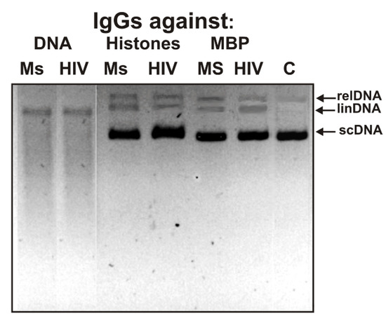 Hydrolysis of the substrate can occur only after its recognition by enzymes/abzymes and the formation of a specific complex. It can be seen that, after 3 h of incubation with IgGs (10 µg/mL) against the DNA of MS and HIV-infected patients, scDNA is completely hydrolyzed to the linear form of DNA (two or more breaks per molecule) and oligonucleotides of different lengths. It is very important that IgGs against five histones corresponding to MS and HIV-infected patients effectively hydrolyzed scDNA during this time by about 25–35% with the formation of a relaxed (one break per molecule) and linear form of DNA. Moreover, IgGs of MS and HIV-infected patients against MBP also hydrolyzed DNA by 20–35%. An increase in the concentration of IgGs against five histones and MBP and the incubation time led to the formation of short hydrolysis products, as in the case of Abs against DNA. These data indicated that, as in the case of monoclonal antibodies against MBP obtained by Phage display [29], the active centers of some monoclonal antibodies in the fractions of polyclonal IgGs of HIV-infected and MS patients against histones and MBP could combine at least two activities—protease and DNase.