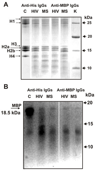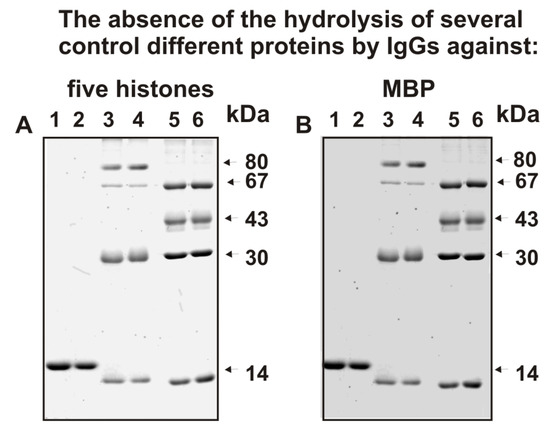 It was shown that antibodies of HIV-infected patients efficiently hydrolyze all human histones [43]. In addition, IgGs of HIV-infected patients against MBP and five histones possess polyspecific complex recognition and enzymatic cross-reactivity in the hydrolysis of five histones and MBP [48,49,50]. Hiv-IgG against five histones and MBP used in this study also hydrolyzed five histones (Figure 2A,B). In this work, we have shown for the first time that IgGs of MS patients against five histones split five histones (Figure 2A,B).