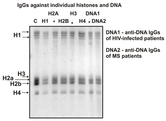 It can be seen that all IgG preparations hydrolyze five histones to varying degrees. The maximum activity in the hydrolysis of all five histones is demonstrated by antibodies against histone H1 (line H1). A particular question was whether IgG antibodies against DNA, which have a high affinity for DNA cellulose, are capable of hydrolyzing five histones. It turned out that IgGs of HIV-infected (lane DNA1) and MS (lane DNA2) patients also effectively hydrolyze all five histones (Figure 4). Together with the results of DNA hydrolysis with IgGs against five histones (Figure 1), these data indicated that the catalytic centers of antibodies against histones might contain specific structural elements of canonical DNases, while the active centers of anti-DNA IgGs may contain amino acid residues of canonical proteases. A feature of IgGs against histones and MBP is that, unlike canonical proteases, they hydrolyze only histones and MBP, but not other control proteins [48,49,50].