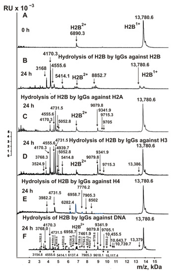 The fractions of IgGs with high affinity to five individual histones (H1–H4), MBP and DNA were used to find the cleavage sites of H2B by MALDI TOFF mass spectrometry. After the addition of the IgGs at a time of zero (Figure 5A), the H2B histone was nearly homogeneous, demonstrating only signals of its one- (m/z = 13,780.6 Da) and two-charged ions (m/z = 6890.3 Da).