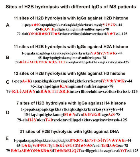 - Baranova, S.V.; Mikheeva, E.V.; Buneva, V.N.; Nevinsky, G.A. Antibodies from the Sera of Multiple Sclerosis Patients Efficiently Hydrolyze Five Histones. Biomolecules 2019, 9, 741. [Google Scholar] [CrossRef]