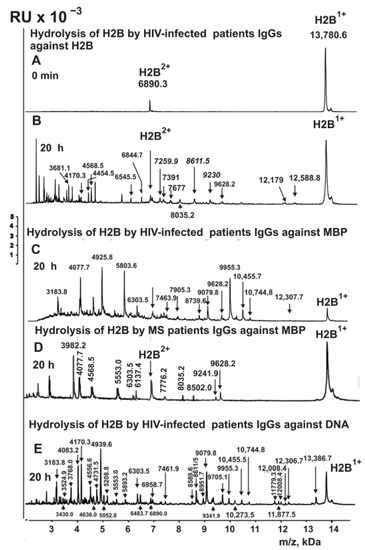 The polyspecificity in binding recognition and catalytic cross-reactivity of IgGs against various histones from the blood of HIV-infected patients was investigated using MALDI mass spectroscopy earlier in several studies [48,49,50]. In this work, IgGs were isolated from the blood of HIV-infected patients against H2B histone, MBP and DNA. It was interesting to understand whether HIV-infected patients’ antibodies against H2B histone and MBP are capable of hydrolyzing H2B and DNA and vice versa. Figure 7 shows the spectra of the products of H2B hydrolysis by antibodies of HIV-infected patients against H2B, MBP, and DNA.