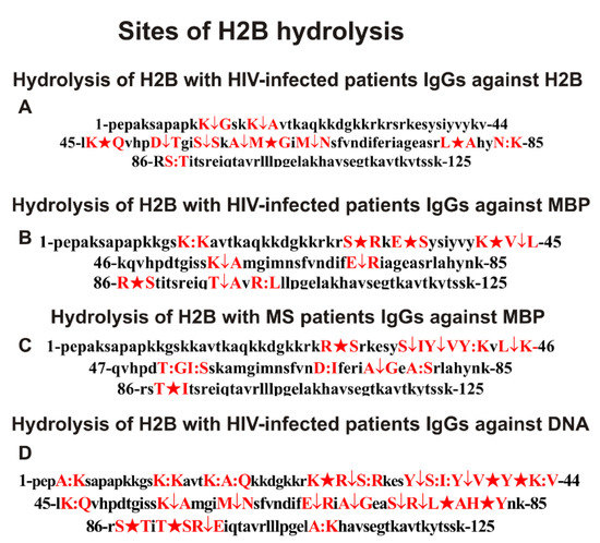Hydrolysis of H2B by HIV-infected patients’ antibodies against this histone occurs at 11 sites (Figure 8A, Table 1). For hydrolysis of H2B with antibodies against MBP of HIV-infected patients, 10 hydrolysis sites were found (Figure 8B, Table 1). Interestingly, there is no overlap among these sites. For comparison, Table 1 shows the data on the sites of H2B hydrolysis by IgGs against MBP of MS patients. In the case of Abs against MBP of MS patients, 11 hydrolysis sites were found (Figure 8C). The 10 and 11 sites of H2B hydrolysis by IgGs against MBP from the blood of HIV-infected and MS patients (Figure 8B,C) are located mainly in the same clusters of this histone sequence. However, there are also no same sites of H2B cleavage (Figure 8B,C).