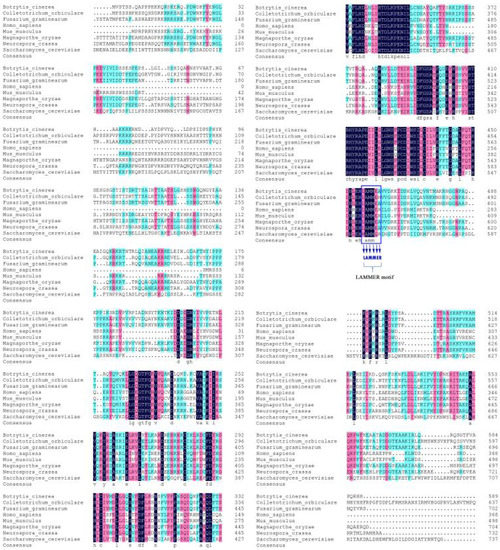 We used the Kns1 peptide sequence from budding yeast as the query in a BlastP search within the M. oryzae genome database in EnsembIFungi (http://fungi.ensembl.org/Magnaporthe_oryzae/Info/Index) (accessed on 20 July 2018). We identified a Kns1 homolog (MGG_16904) that shared 51% amino acid similarity with Kns1, which we named MoKns1. MoKns1 showed high homology with its orthologues in other fungi (Figure 1), including FgKNS1 of Fusarium graminearum (53% identity), CoKNS1 of Colletotrium orbiculare (67% identity), HsKNS1 of Homo sapiens (53% identity), MmKNS1 of Mus musculus (46% identity), NcKNS1 of Neurospora crassa (58% identity). MoKns1 encodes a LAMMER kinase comprising 704 amino acids, which contains a conserved LAMMER motif. Our results revealed that Kns1 is well conserved across various organisms including yeast, filamentous fungi, plants, mammals and Homo sapiens (Figure 1).