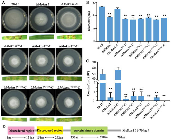 MoKns1 is important for growth, conidiation and pathogenicity. (A). The wild-type 70−15 strain, the ΔMokns1 mutant and the ΔMokns1N1–C, ΔMokns1N2–C, ΔMokns1N3–C, ΔMokns1N1+N2–C, ΔMokns1N2+N3–C, ΔMokns1N1+N3–C, ΔMokns1–C complemented strains were grown on CM medium for 9 days. (B). Statistical analysis of the diameters of hyphae from the WT, the ΔMokns1 mutant and the ΔMokns1N1–C, ΔMokns1N2–C, ΔMokns1N3–C, ΔMokns1N1+N2–C, ΔMokns1N2+N3–C, ΔMokns1N1+N3–C, ΔMokns1–C complemented strains on CM (Ducan’ test, ** p < 0.01). (C). Statistical analysis of conidia production (Ducan’ test, ** p < 0.01). (D). Map of MoKns1 with three domains.