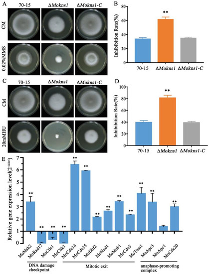 MoKns1 is involved in the DNA damage stress response. (A,C), sensitivity test for DNA damage stress using hydroxyurea (HU) and methyl methanesulfonate (MMS). The strains were incubated on CM supplemented with 20 mM HU or 0.02% MMS at 28 °C for 8 days. (B,D), the inhibition rate was determined by plotting the percentage of colonies in the presence of various stresses in comparison with the control. Asterisks denote statistical significances (p < 0.01). (E). Relative mRNA levels of DNA damage checkpoint genes (MoMSH1/MGG_00879, MoRAD17/MGG_17052, MoCDS1/MGG_04790, MoCHK1/MGG_03729), mitotic exit genes (MoCDC14/MGG_04637, MoCDC15/MGG_04100, MoDBF2/MGG_02757, MoNUD1/MGG_02395, MoMOB1/MGG_03151, MoCDC5/MGG_09960, MoTEM1/MGG_04896), anaphase-promoting genes (MoAPC3/MGG_17195, MoAPC1/MGG_03314, MoCDC201/MGG_01236) were quantified using qPCR, and the results for the aerial mycelia of the ∆Mokns1 mutant were normalized to α-ACTIN expression and compared to the results for the WT. Error bars represent standard deviation. Significant differences compared with the wild-type strain were estimated using Duncan’s test (** p < 0.01).