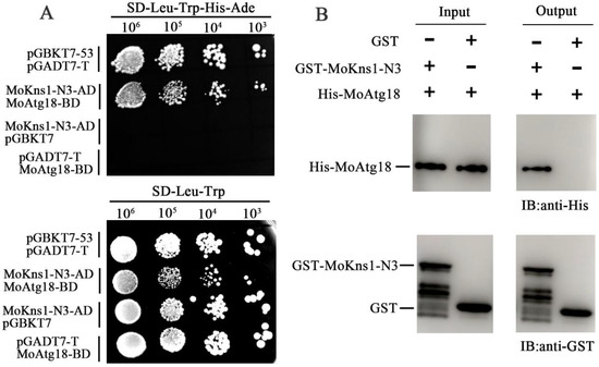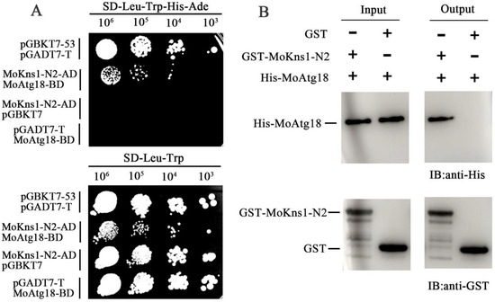 MoKns1–N2 interacts with MoAtg18. (A). Yeast two-hybrid analysis. The pair of plasmids pGBKT7−53 and pGADT7−T was used as the positive control. The plates were incubated at 30 °C for 3 days before being photographed. (B). Pull-down assays. Recombinant GST–MoKns1–N2 or GST bound to glutathione Sepharose beads was incubated with an E. coli cell lysate containing His−MoAtg18. The eluted proteins were analyzed by immunoblotting (IB) with the monoclonal anti−His and anti−GST antibodies.