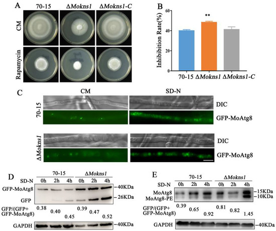MoKns1 is involved in autophagy. (A). Sensitivity test to Rapamycin (Duncan’s test, ** p < 0.01). (B). The inhibition rate was determined by comparing the percentage of colonies in the presence of Rapamycin to the percentage of colonies in the control. Asterisks denote statistical significances (p < 0.01). (C). The localization of GFP−MoAtg8 in the 70−15 strain and the ΔMokns1 mutant. The strains were cultured in liquid CM medium for 2 days, then transferred to SD−N medium for 4 h. Bar, 10 μm. (D). Immunoblot analysis of the degradation of GFP−MoAtg8 in SD−N medium for 2 h and 4 h in the WT strain and ΔMokns1 mutant. (E). Immunoblot analysis of MoAtg8/MoAtg8−PE turnover in the wild-type 70−15 strain and ΔMokns1 mutant.