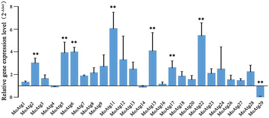 Analysis of the expression levels of core autophagy genes in M. oryzae. The relative mRNA levels of core autophagy genes (MoATG1/MGG_06393, MoATG2/MGG_16734, MoATG3/MGG_17909, MoATG4/MGG_03580, MoATG5/MGG_09262, MoATG6/MGG_03694, MoATG7/MGG_07297, MoATG8/MGG_01062, MoATG9/MGG_09559, MoATG11/MGG_04486, MoATG12/MGG_00598, MoATG13/MGG_454, MoATG14/MGG_03698, MoATG15/MGG_12828, MoATG16/MGG_05255, MoATG17/MGG_07667, MoATG18/MGG_03139, MoATG20/MGG_12832, MoATG22/MGG_09904, MoATG23/MGG_10579, MoATG24/MGG_03638, MoATG26/MGG_03459, MoATG27/MGG_02386, MoATG28/MGG_08061, MoATG29/MGG_02790) were quantified using qPCR, and the results were normalized to α-ACTIN expression and compared to the WT results in the aerial mycelia of ∆Mokns1 mutant. Error bars represent standard deviation. Significant differences compared with the WT were estimated using Duncan’s test (** p < 0.01).