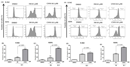 K-562 and FEPS cell lines were seed into 12-well plates at a 50 × 10³ per well for 24 h. After, cells were exposed to CNN1 (0.1 µM) for 24 h. The positive control used IM (0.1 µM) and DMSO (0.02%) was used as negative control. Subsequently, cells were washed with PBS and resuspended in 200 µL Annexin-binding buffer consisting of 4 μL Annexin V-FITC and then incubated with propidium iodide for 20 min. After incubation, cells were resuspended in 1× binding buffer. The fluorescent emission was measured by flow cytometry system (BD FACSVerse) [80].