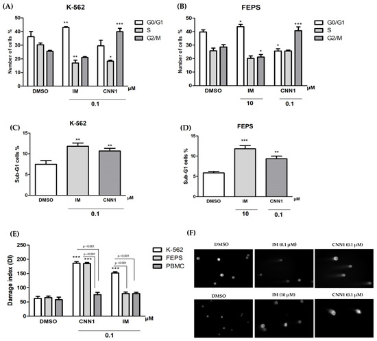 Induction of DNA fragmentation, cell cycle arrest and genotoxic effect after treatment with CNN1 in leukemia cells and PBMC by alkaline comet assay. IM was positive control: (A) Effect of CNN1 in cell cycle in K-562 cell line; (B) activity of CNN1 in cell cycle in FEPS cell line; (C) representation of effect of CNN1at number of cells in sub-G1 of K-562; (D) number of cells in sub-G1 phase of K-562 and FEPS cell lines after CNN1 exposure; (E) alkaline comet assay in leukemia cell lines and PBMC; (F) distribution of DNA migrations from negative control (DMSO) and treated groups, using light microscope. The number of cells in G0/G1, S and G2/M phase was calculated using FlowJo™ software. Treated samples were compared to DMSO. The bars represent the mean ± standard error of the mean of three independent experiments. Significant differences compared to control (DMSO) * p < 0.05, ** p < 0.01, *** p < 0.001 by ANOVA followed by Bonferroni post-test.