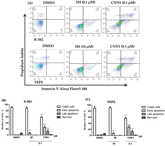 In order to investigate whether CNN1 compound promotes apoptosis after 24 h of treatment, annexin V-Alexa Fluor® 488 and PI were used by flow cytometry (Figure 3A). After exposure of CNN1 (0.1 µM), the results showed a significant increase (p < 0.001) in early apoptotic cells (Annexin-V positive/PI negative) and an increase in late apoptosis (Annexin V-positive/PI-positive) in K-562 and FEPS cell lines (p < 0.001) (Figure 3B,C), when compared to the negative control, demonstrating the apoptosis as a cell death pathway. IM (0.1 µM or 10 µM) also showed a significant increase in apoptotic cells in leukemia cells.
