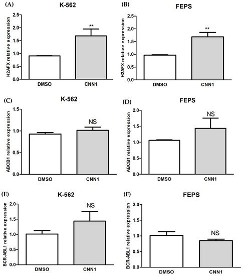 Relative gene expressions of H2AFX, ABCB1 and BCR-ABL1 in K-562 and FEPS cell lines after 18h of treatment: (A) CNN1 significantly modulated H2AFX expression in K-562 cell line; (B) CNN1 also demonstrated an increased H2AFX expression in FEPS cell line; (C) no significant ABCB1 expression was observed after treatment with CNN1 in K-562 cell line; (D) CNN1 did not caused significant differences in ABCB1 expression after treatment in FEPS cell line; (E,F) CNN1 did not significantly modulated BCR-ABL1 expression in K-562 and FEPS cell lines, respectively. Results are expressed as the mean ± SD of three independent experiments. Treated samples were compared to DMSO and statistically analyzed by t-test. Significant differences: ** p < 0.01. NS = non-significant.
