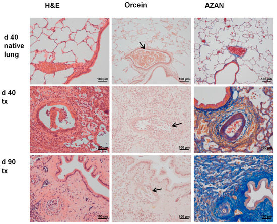 Histopathology of native lungs and allografts (tx). Representative paraffin sections stained with hemalum and eosin (H&E), acidic orcein, or Heidenhain’s AZAN are shown (n ≥ 4 each). Experimental animals were euthanized 40 and 90 days after transplantation (d 40, d 90). Arrows are pointing to the internal elastic membrane of arteries, which are visualized by orcein. Extracellular matrix is stained in blue after AZAN staining.