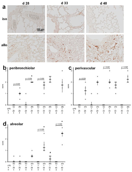 B cell infiltration was investigated by immunohistochemistry using monoclonal antibody OX33, directed to a pan-B cell marker. Pulmonary isografts and allografts before treatment with LPS (day 28) as well as one, five, and twelve days thereafter (days 29, 33, and 40) and five days after application of the control solution PBS (day 33) were investigated. Right native lungs were exclusively analyzed on day 33. Technical controls, in which the primary antibody was omitted, were virtually unstained. Immunopositive B cells were scarce in all isografts as well as in the right native lungs of both isograft and allograft recipients. In contrast, in all pulmonary allografts, B cell infiltrates were seen in perivascular and peribronchiolar regions, and after the application of LPS, B cells were also detected in the alveolar space (Figure 2a). For exploratory semi-quantification, a scoring system was used ranging from zero, corresponding to no increase in B cell density, to three, corresponding to the highest density of B cells observed. An allograft-specific increase in B cell density was seen in peribronchiolar (Figure 2b; p = 0.029, n = 4) and perivascular (Figure 2c; p = 0.029, n = 4) regions. Upon instillation of LPS (day 40 allografts) perivascular B cells tended to be more abundant compared to day 28 allografts (p = 0.086). The abundance of B cells in the alveolar space significantly increased in response to instillation of LPS but not to PBS. This increase was most prominent on postoperative day 40, twelve days after LPS instillation (Figure 2d; p = 0.029, n = 4). B cell abundance in right native lungs was very low (score 0) and remained unchanged after application of LPS (Supplementary Figure S1).